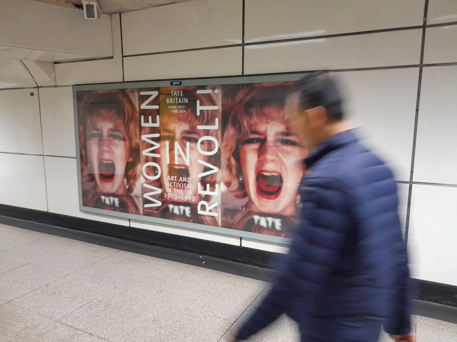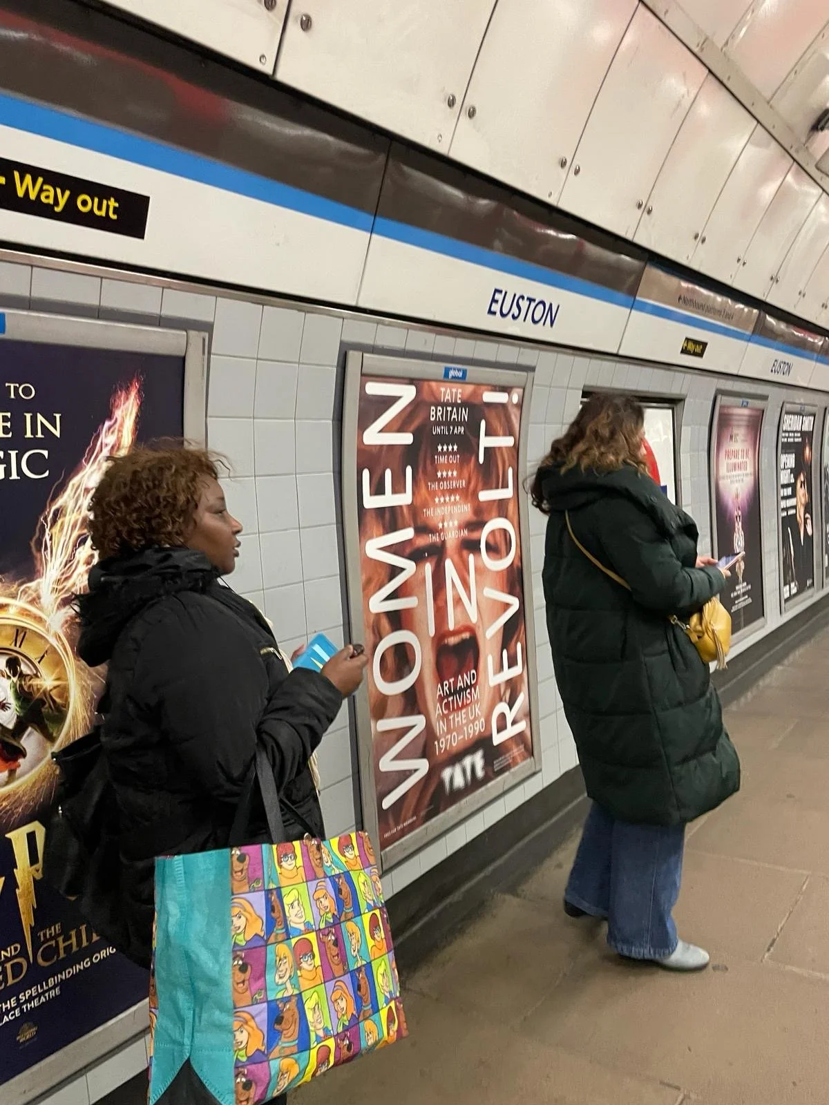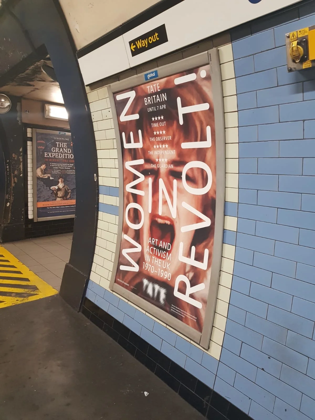 01. gina and linsey young curator at Women in Revolt with our passes with my scream face on it.jpg